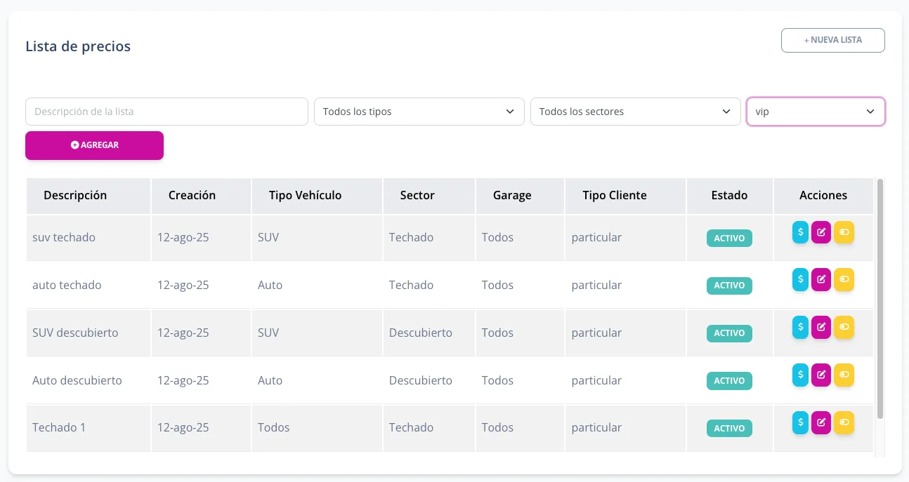 Definí listas por temporada, tipo de vehículo y zonas del parking.